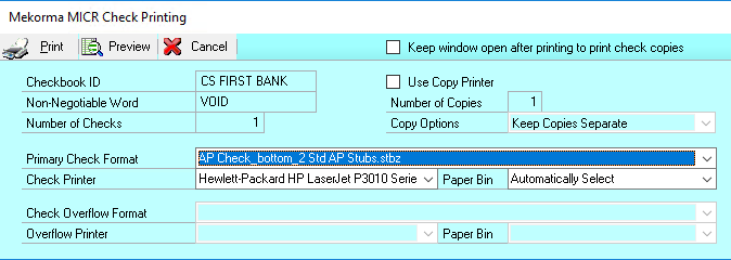 Special Features of the Mekorma MICR Check Printing ScreenWhen printing checks with Mekorma MICR the Mekorma MICR Check Printing screen replaces the standard Microsoft Dynamics GP printer screen The settings on this window are specific to Mekorma MICR Mekorma MICR Check Printing screen contains these options: Checkbook ID Displays the selected checkbook Non-Negotiable Word Displays the non-negotiable word entered in the Mekorma MICR Setup screen (if applicable) Number of Checks Displays the number of checks being printed Keep Window open after printing to print check copies: Check this option to keep the Mekorma MICR Check Printing screen displayed after printing checks so you can print check copies If you check the Keep Print Window Open After Printing option on the Mekorma MICR System Options screen this option is checked by default Use Copy Printer Check this option to display additional printer selections for printing check and overflow copies at the same time you are printing the checks Check Stub Displays the check stub format selected in the Check Face field of the Mekorma MICR Setup screen Click the field hyperlink to launch the Mekorma MICR Configurator layout tool Click the drop-down arrow to change the selected check stub format Check Printer Select a printer for printing checks The program remembers the last printer selected Overflow Stub: Displays the overflow stub format selected in the Overflow Stub Format field of the Mekorma MICR Setup screen Click the field hyperlink to launch the Mekorma MICR Configurator layout tool Click the drop-down arrow to change the selected check stub format Overflow Printer Select a printer for printing overflow or remittance information The program remembers the last printer selected Paper Bin Select a paper bin for the applicable printer The program remembers the last bin selected Click Print to print the selected checks and/or check copies Preview to view a preview of the checks before you print Cancel to close the Mekorma MICR Check Printing screen